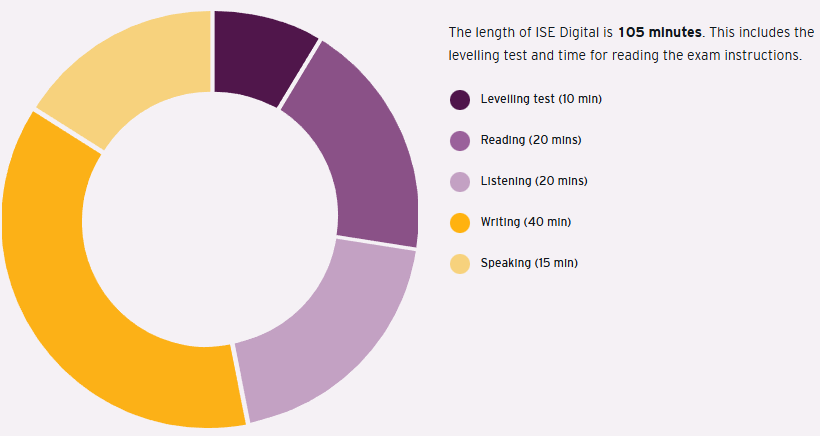 ISE Digital tiene una duración de 105 minutos que abarca tanto el tiempo del examen de las cuatro destrezas, como el tiempo destinado para leer las instrucciones.